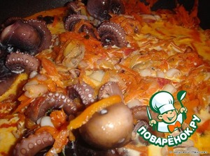 После того как зажарка приобретет ярко оранжевый цвет закидываем в неё осьминожек и морской коктейль, жарим еще примерно минуты 3, заливаем смесью сливок и молока. Солим, перчим, добавляем специи по вкусу. Тушим на тихом огне под крышкой минут 15-20.