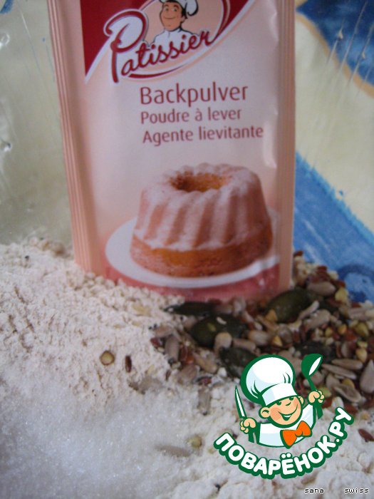 • В салатнице перемешаем муку, сахар, разрыхлитель и семечки,