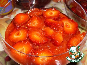 Поверх застывшего клубничного пюре выкладываем нарезанные ягоды клубники (для этого мы оставляли часть ягод).