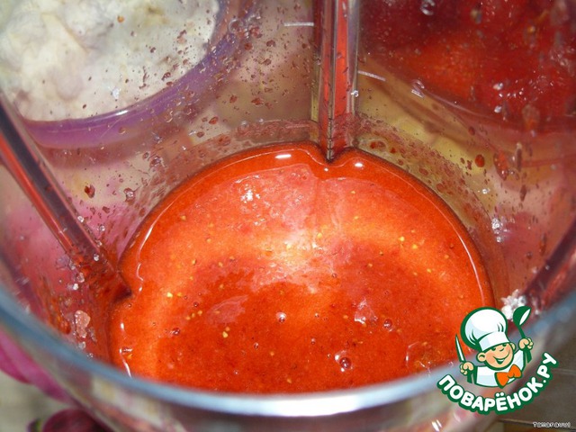• Клубнику промываем и даем хорошо стечь воде. Горсточку клубники оставляем, а остальную отправляем в блендер.
