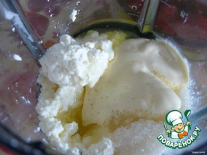 • Готовим творожный крем: творог, сметану, сахар и яичный белок взбиваем в однородную массу. Творожная масса должна увеличиться в два раза. У нас должен получиться нежный и воздушный творожный крем.