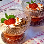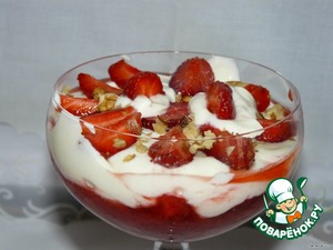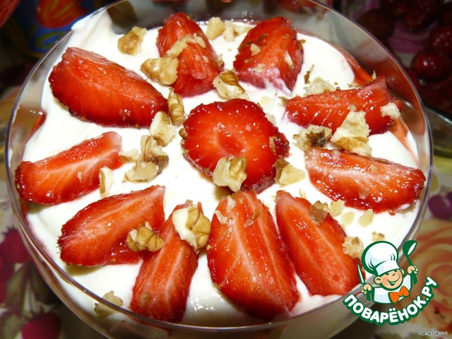 Поверх клубничного желе и ягод выкладываем творожный крем. Украшаем целыми или резаными ягодами и посыпаем орехами. Даем немного постоять в холодном месте.