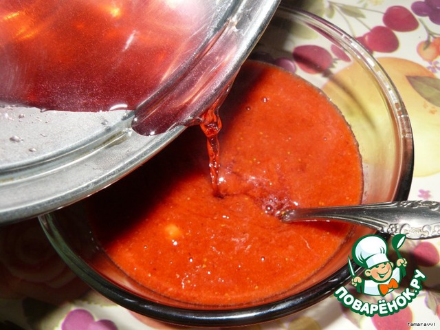 • Сваренное желе аккуратненько вливаем в клубничное пюре и перемешиваем.