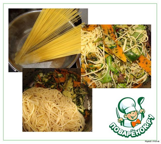 Одновременно с обжариванием овощей отварить спагеттини в подсоленной воде, готовность al dente.