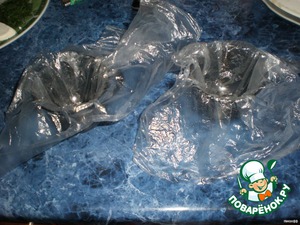Застелить формочки плёнкой, оставив длинные края.