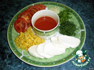 Обмакивать кружки помидоров в сок с желатином и класть на дно форм. Посыпать солью, перцем, чесноком и зеленью. Сверху слой сыра, так же обмакивая в сок. Приправить и посыпать зеленью. Затем слой кукурузы, его тоже слегка смочить соком. Посыпать зеленью с чесноком. Слои повторить. Оставшийся сок влить в формы.