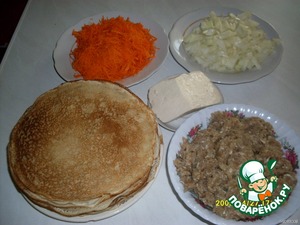 Лук с морковью обжариваем и выкладываем на блины. Сверху-сеточку из майонеза.