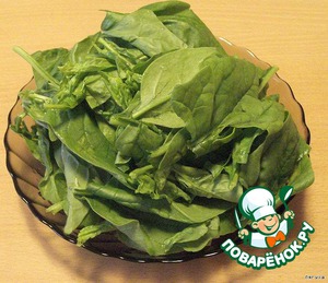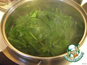 Приготовить тесто для блинов. В воду добавить муку, яйцо, соль, сах. песок и.. . измельченный шпинат. Все хорошо перемешать.