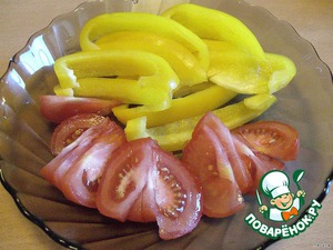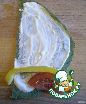 Разрезать блин пополам. Каждую половинку намазать соусом. Выложить на край блина перец и помидор и скрутить рулетиком.