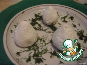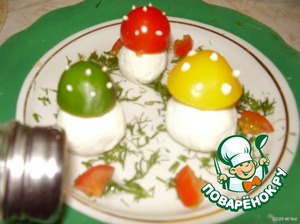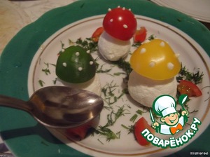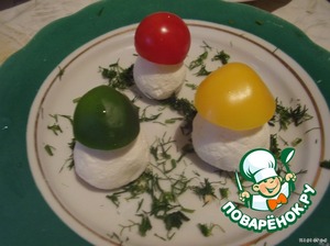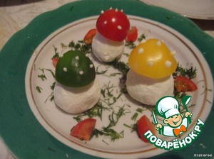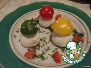 тарелку посыпаем зеленью укропа, творог растираем со сливочным маслом и солью, добавляем натертый на мелкой терке чеснок, перемешиваем, формируем 6 конусов и хорошо их охлаждаем, выставляем на тарелку - это "грибочки"