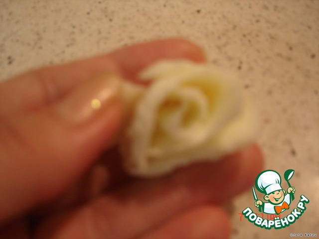Начинаем украшать. Из белка яйца делаем бутоны и сами розочки, аккуратно, ножом, делаем вот такие полоски и начинаем скручивать, придавая форму розочки
