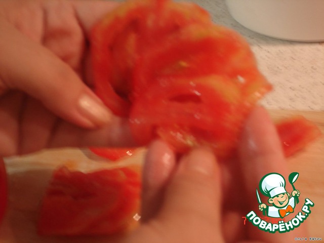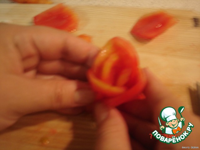 Начинаем их сварачивать, формируя листочки розы, добавляя с каждой стороны по пластинке помидора.