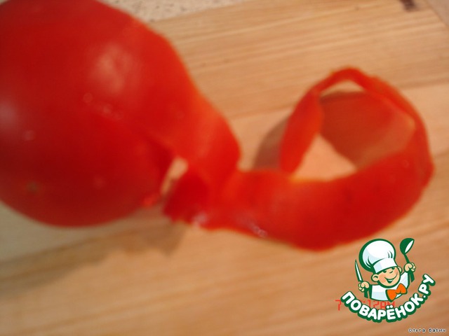Для бутона роз из помидора аккуратно срезаем кожуру, оставляя немного помидора