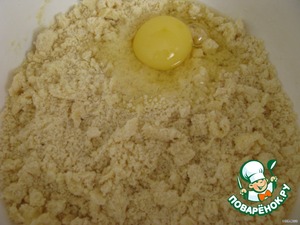 Добавить яйцо и размягчённое масло и перетереть муку в крошку