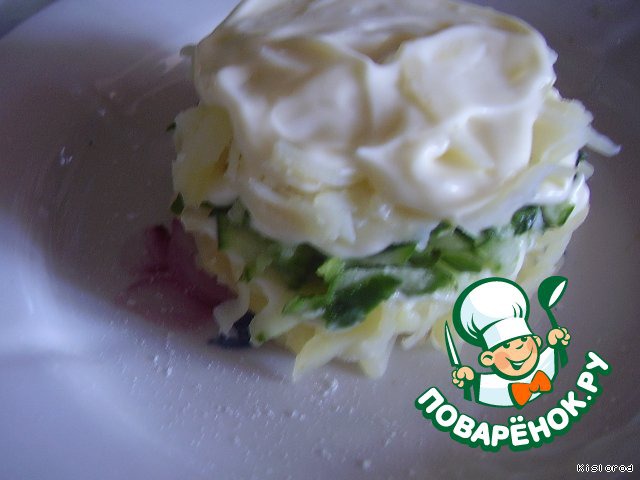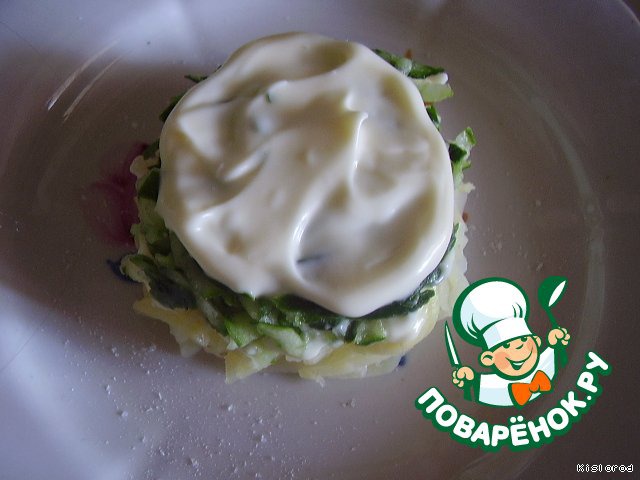снова слой картофеля, присолить, смазать майонезом