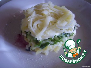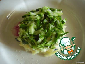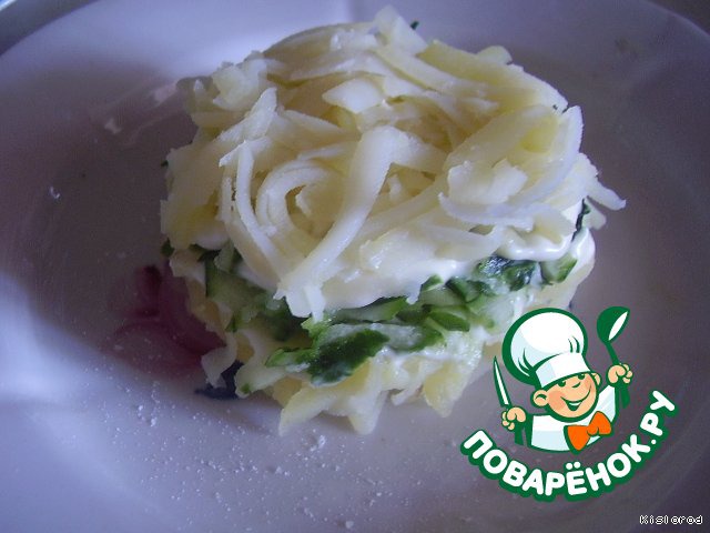 теперь огурец натереть на крупной терке и выложить слоем сверху, присолить