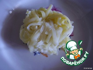 картофель натереть на крупной терке и выложить слой на тарелочку, присолить