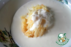 Сливки взбить с сахарным песком. Яблоко натереть на крупной терке, добавить в сливки.