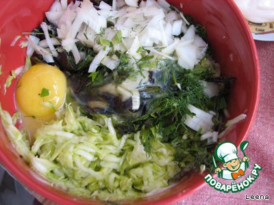 Соединяем кабачки, зелень, лук и чеснок, добавляем яйцо и муку. Перемешиваем и жарим оладушки.