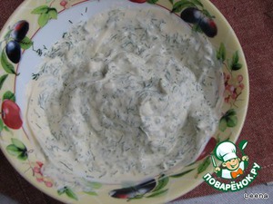 Делаем соус: майонез соединяем с мелко нарезанным укропом и измельченной долькой чеснока.