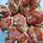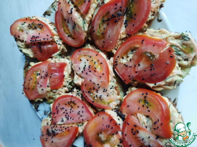 И теперь на подготовленные подушечки выкладываем порезанные дольками помидоры - арбузики. Сверху делаем корочку из зеленого перца (или огурчика), которую "приклеиваем" оставшимся соусом. Арбузики посыпаем семенами найджелы.