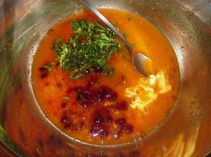 К фруктовому соку добавляем мускатный орех, мелко нарубленные петрушку и базилик, горчицу и брусничный джем. Всё тщательно перемешиваем. Солить и перчить необязательно, это зависит от вкуса. У меня была жгучая горчица, поэтому соли и перца я не добавляла.
