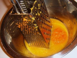 В глубокую миску отжимаем из абрикоса и апельсина сок с мякотью. Самый простой способ - натереть фрукты на тёрке. Все лишние косточки и кожицу в процессе выбрасываем.