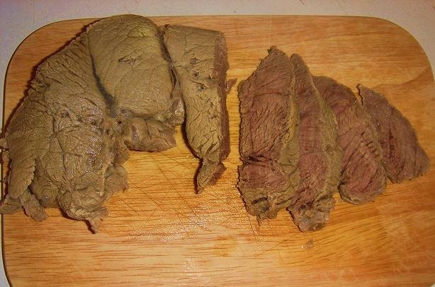 Вареное мясо (горячее или холодное - без разницы) нарезаем ломтиками.