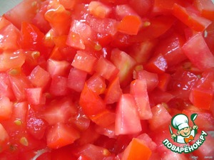 Помидоры нарезаем мелкими кубиками, выкладываем в салатницу,