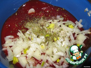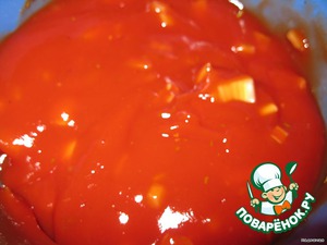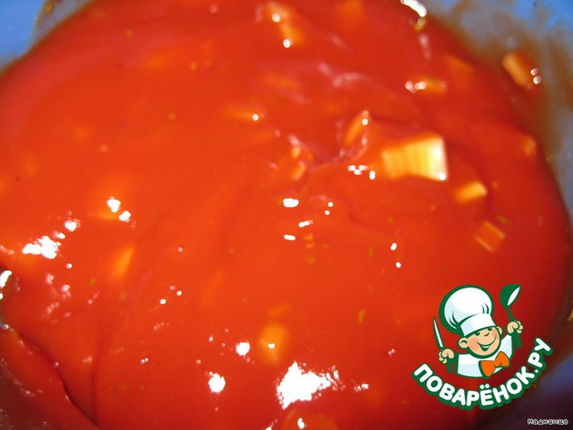Теперь соус: кетчуп или томатный соус перчим, приправляем специями. Добавляем мелко нарезанный чеснок.