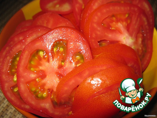 И начинаем выкладывать. Я ставила колечки овощей вертикально. Вообще-то нужно их класть чуть наискосок.
