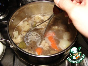 Режем овощи пополам (морковку можно мельче, т. к. она варится дольше всех). Отвариваем овощи в воде до готовности, как закипят, добавляем соль, перец и лавровый лист и варим еще минут 10.