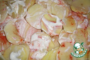 Картошечку очистить, нарезать кружочками, посолить поперчить. Перемешать хорошо, добавив пару ложек майонеза (я паприки сухой добавила). Выкладываем картошечку ровным слоем в глубокий противень, смазанный маслом растительным или сливочным.