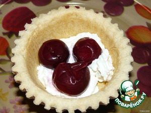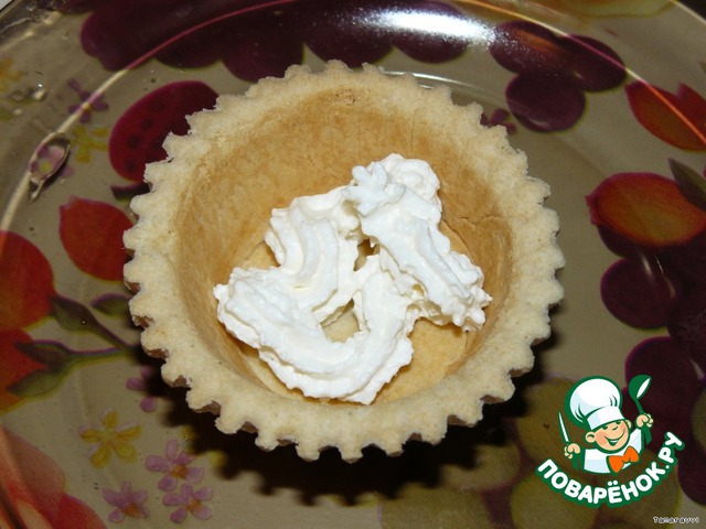 Начинаем собирать наш десерт: На дно тарталетки кладем немного сливок.
