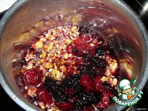 Получившийся сироп, 2-3 столовые ложки, смешиваем с сахаром и нагреваем. В сироп добавляем измельченные орехи и по несколько ягод черешни и ежевики. Даем закипеть, и варим минут 10. Желательно дать полностью остыть.
