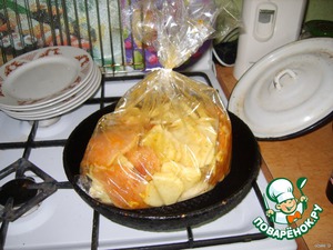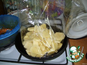 3. Режем пластинами картофель, солим, перчим, складываем в пакет для запекания.