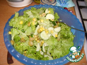 5. Тем временем делаем салат: смешиваем листья салата, огурцы, кукурузу и оливки. Заправляем уксусом, 1 ст.л. масла и специями.