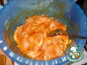 2. Из ингредиентов (соевый соус, кетчуп, острый соус, горчицу, чеснок, 2 ст.л. масла, специи) делаем маринад, опускаем туда мясо.