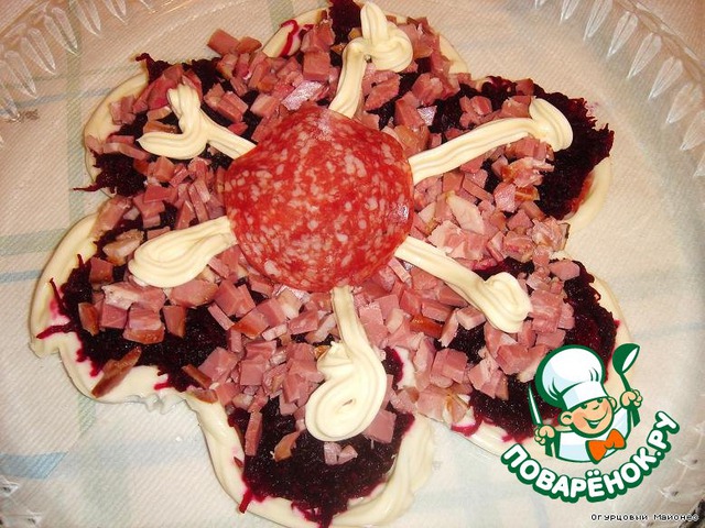 Выкладываем окорок на свёклу. Сверху рисуем майонезом "лучики" и в центр кладём ещё один кружок колбасы.
