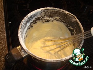 Вскипятить молоко с маслом, посолить,снять с плиты и всыпать в него муку.Снова поставить на плиту и мешать, пока не образуется гладкий ком теста.