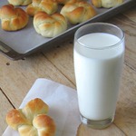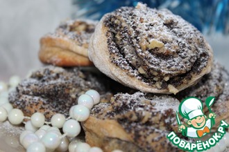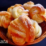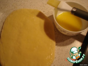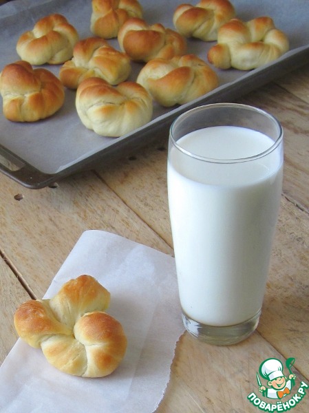 В теплое молоко добавляем разрыхлитель и дрожжи, все соединяем, добавляем муку. Замешиваем тесто, оно должно получиться эластичным и не прилипать к рукам. Делим его на 4 части. Каждую часть раскатать, как на фото, смазать сливочным маслом и завернуть конвертиком. Поставить в холодильник на 30 мин. Достаем, режем на полоски, и сворачиваем узелком.
