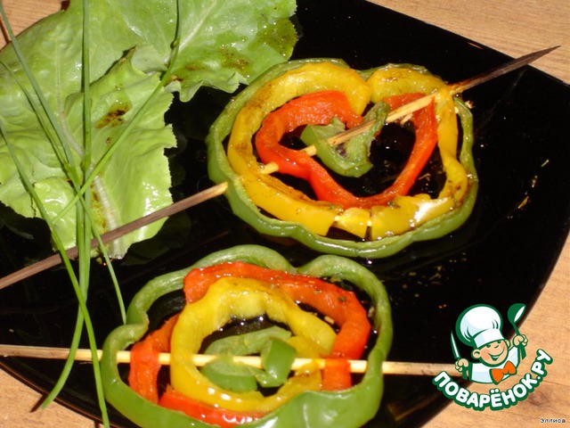Чередуя цвета, нанизываем кружочки перца на палочки, а затем запекаем в духовке или на гриле (лучше на гриле).