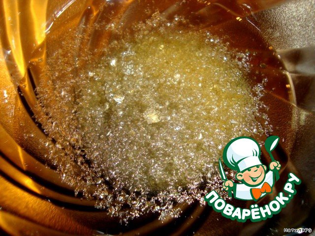 Желатин замочить в очищенной воде, выдержать 30 минут и распустить при нагревании.