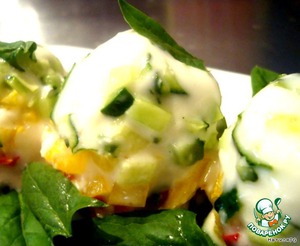 В стаканчики первым слоем выложить нарезанный огурчик. Хотя, это не принципиально. Огурцы залить соусом.