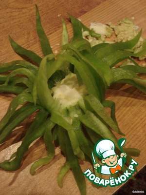 В готовую начинку добавляем мелко нарезанную зелень. Этим фаршем начиняем наши цветы из перца.