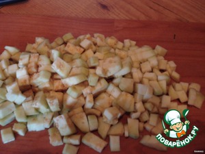 А в это время готовим начинку. Очищаем и нарезаем кубиками баклажаны.