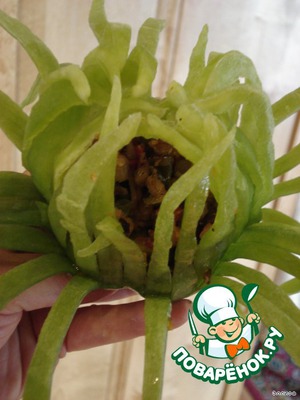Помещаем перец в ледяную воду и отправляем в холодильник на 1-2 часа, чтобы перец приобрел вид цветка.