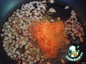 Нарезаем мелко лук, натираем на терке морковь и обжариваем на растительном масле.