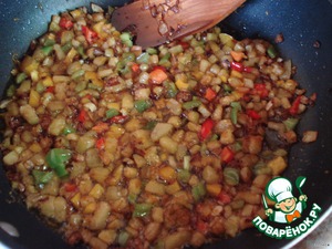 К луку и моркови добавляем баклажаны и нарезанный кубиками сладкий перец.