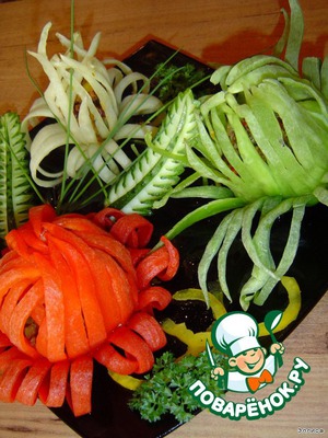 Процесс изготовления цветов из перца я не буду подробно описывать, так как Вы можете познакомиться с ним здесь - https://www.povarenok.ru/recipes/show/16781/